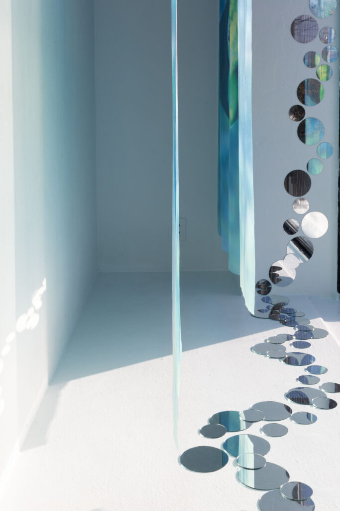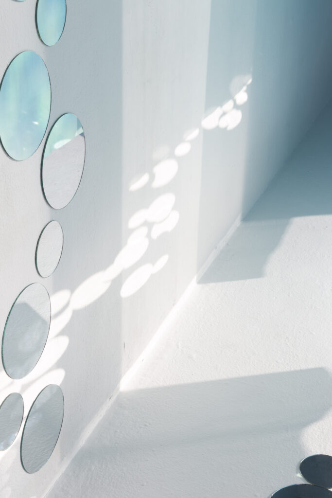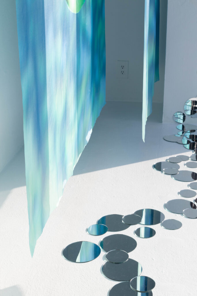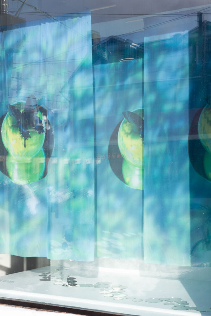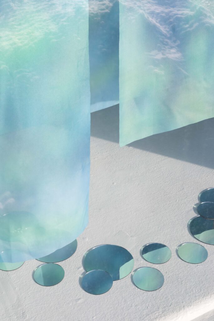 Butterfly Ate That Dream is a photo-based installation exploring longing, fragility, and the in-between state where certainty and uncertainty coexist. Three large silk photographs float in space, their translucency allowing images to blur, overlap, and repeat. Small round mirrors placed on the floor and walls fragment light, reflection, and memory. Together, these elements create a threshold where dreams linger, distort, and wander.