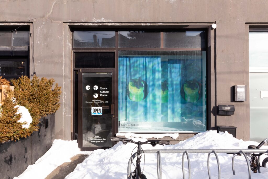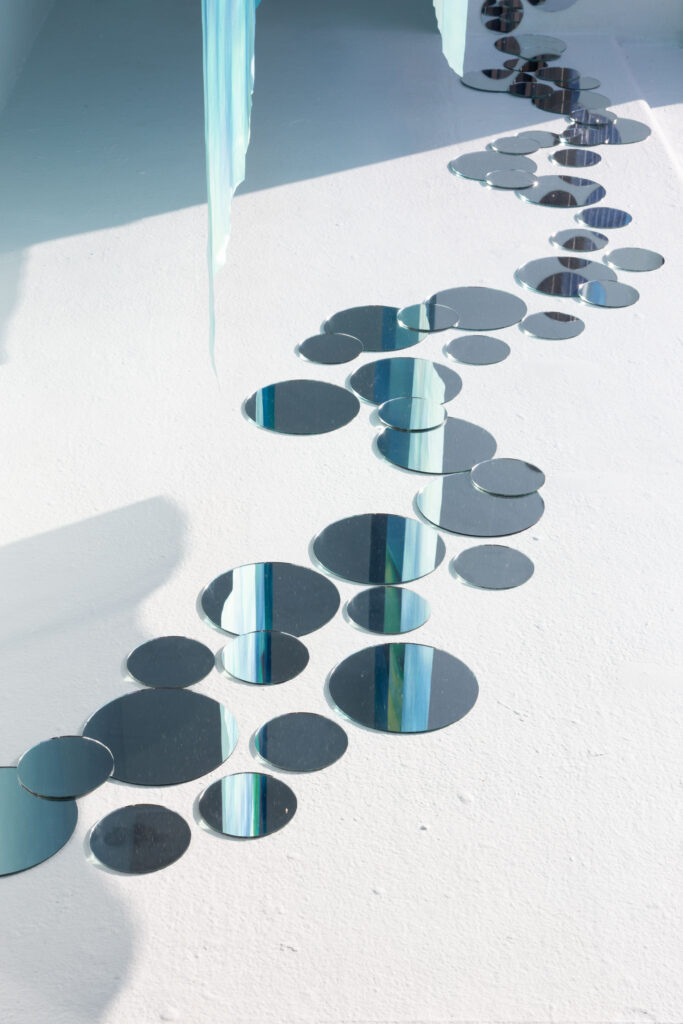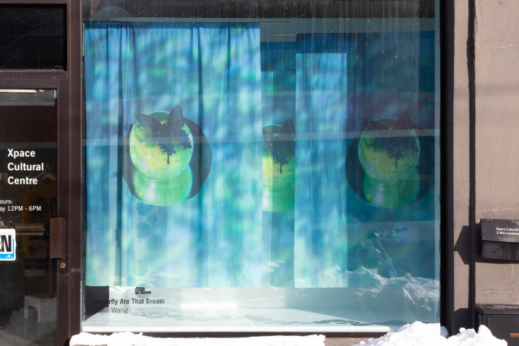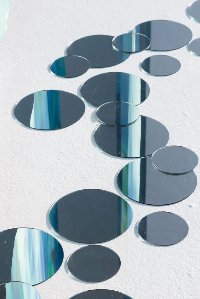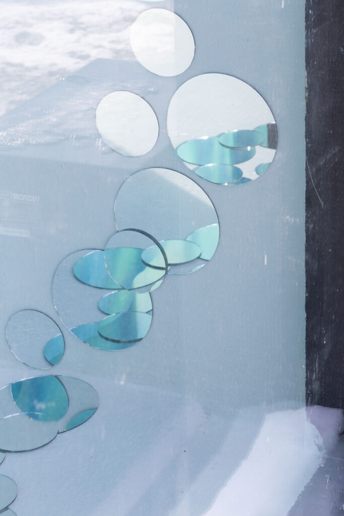 Butterfly Ate That Dream is a photo-based installation exploring longing, fragility, and the in-between state where certainty and uncertainty coexist. Three large silk photographs float in space, their translucency allowing images to blur, overlap, and repeat. Small round mirrors placed on the floor and walls fragment light, reflection, and memory. Together, these elements create a threshold where dreams linger, distort, and wander.