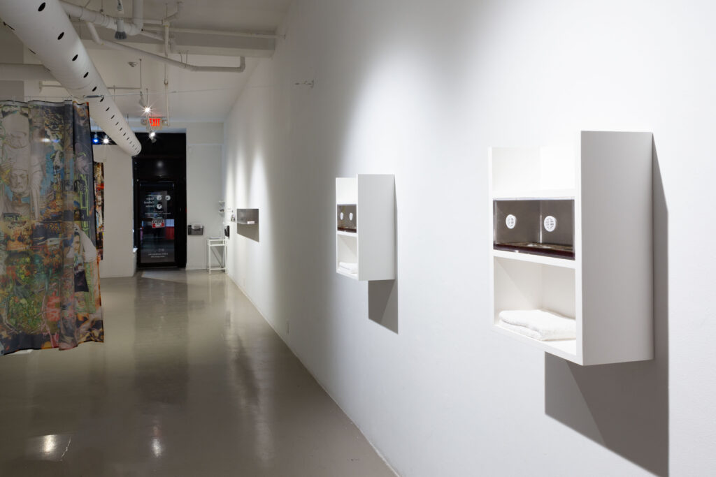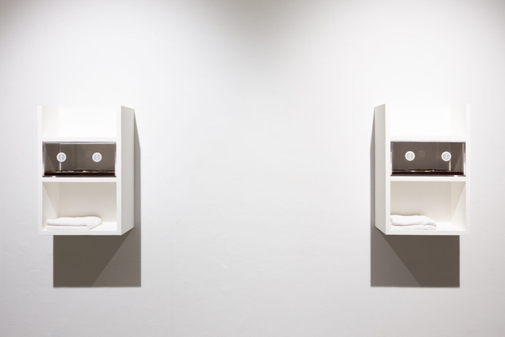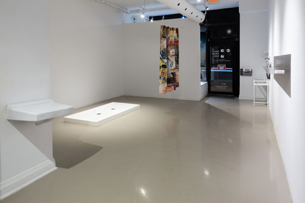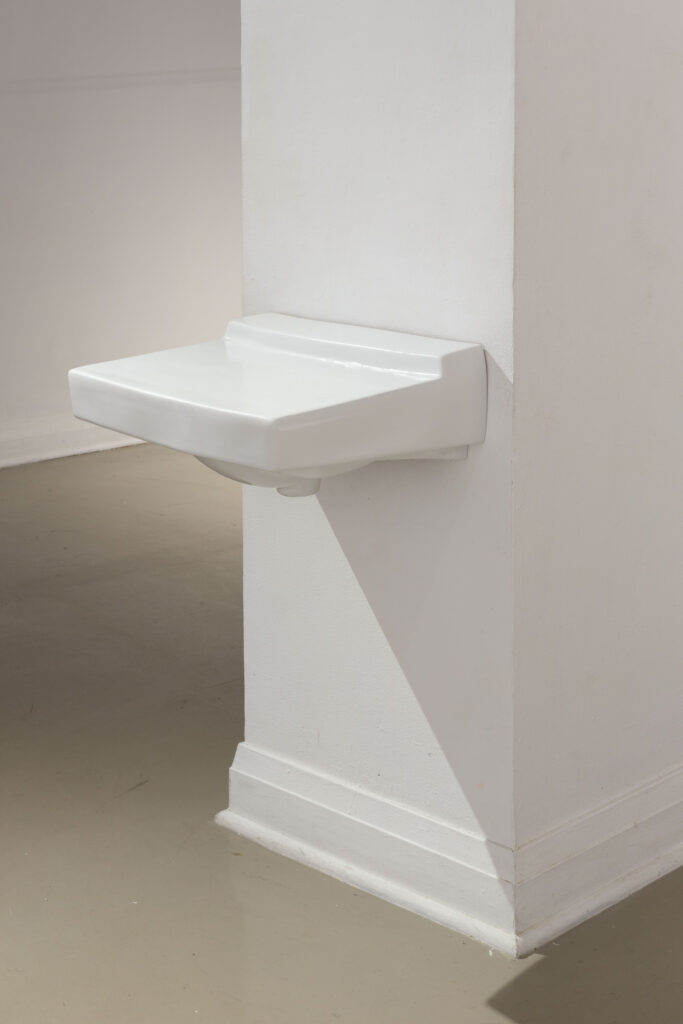 The bathroom is a site of duplicity. It configures fantasies to be realized that, once undertaken, reveal barriers endemic to the flourishing of these fantasies. Desires of purity, care and sustenance drain into despair as promises of self-actualization go unfulfilled. Slick surfaces