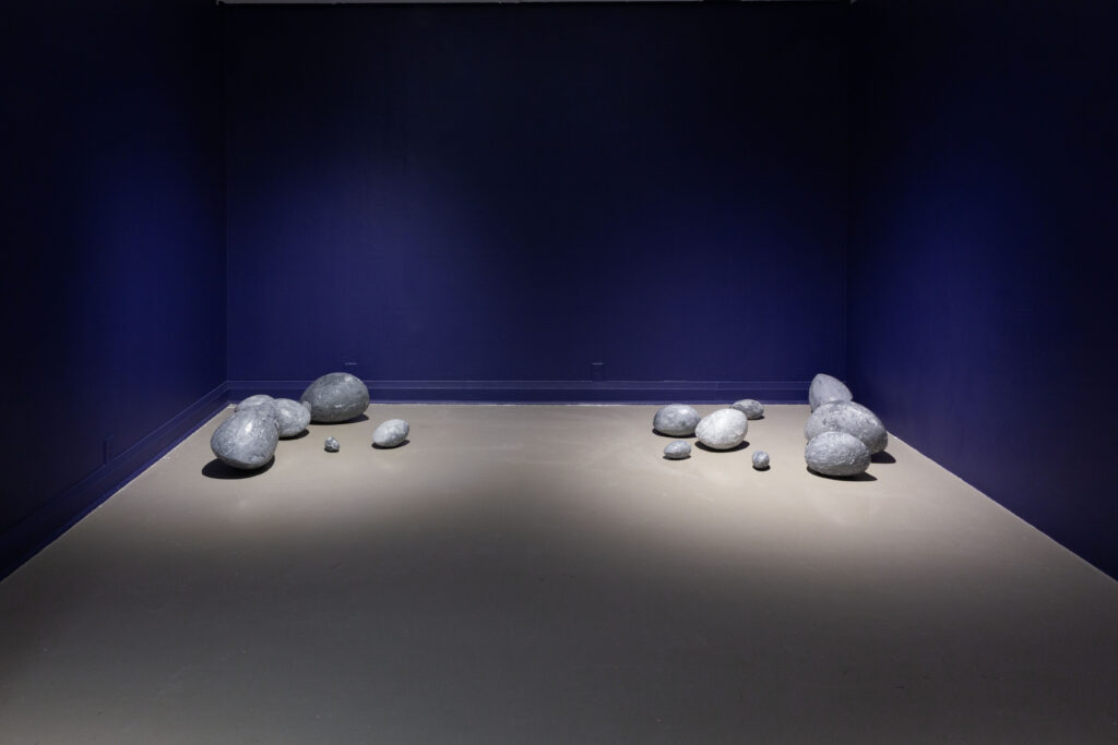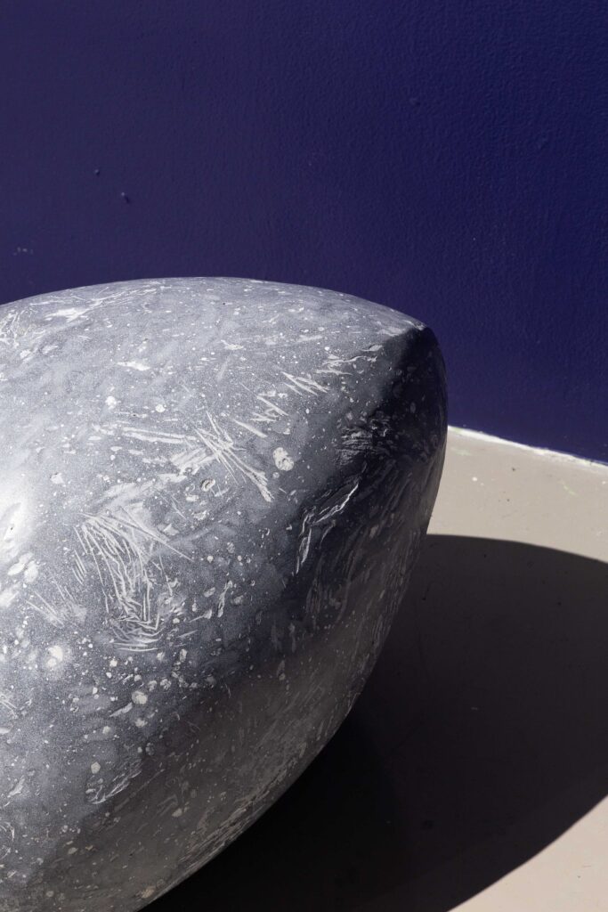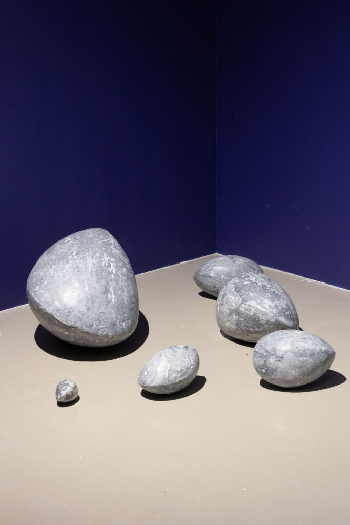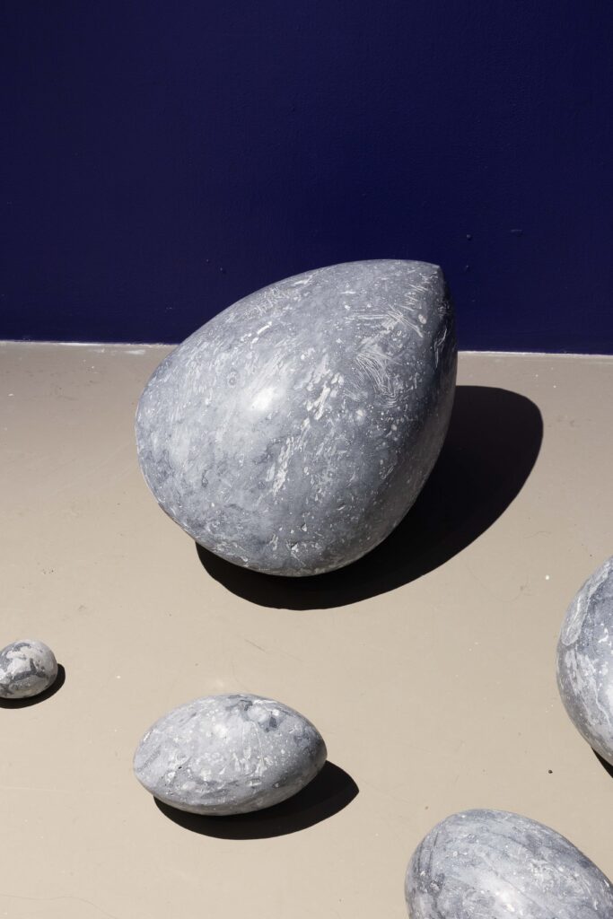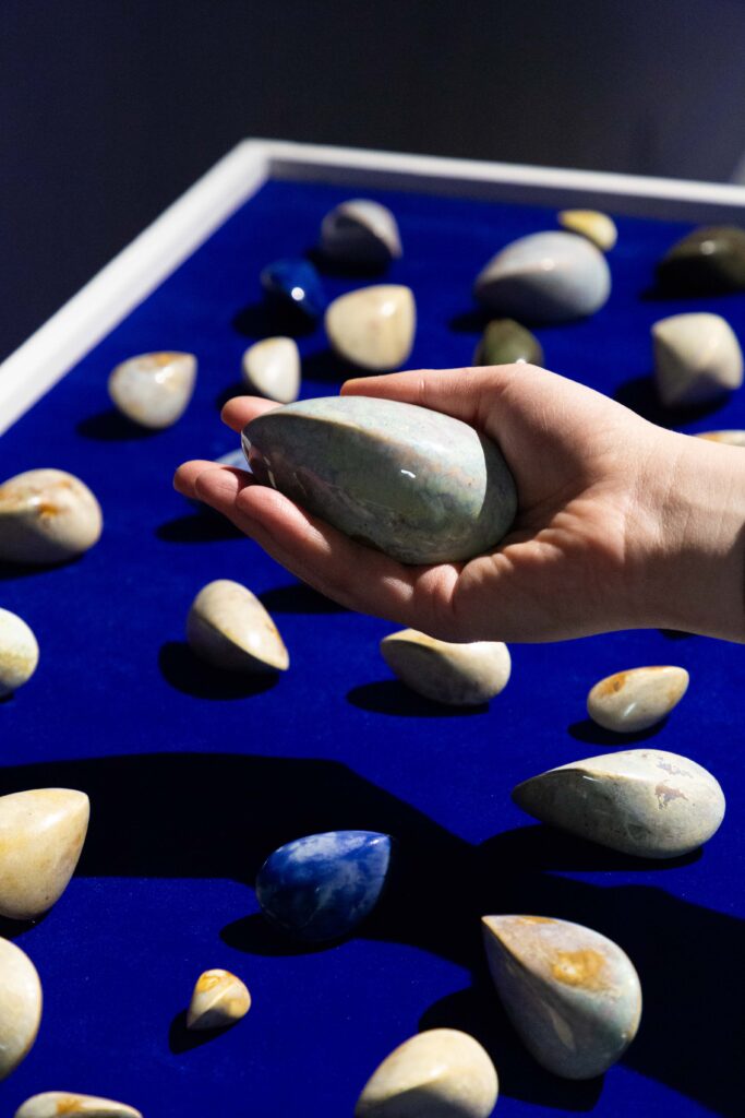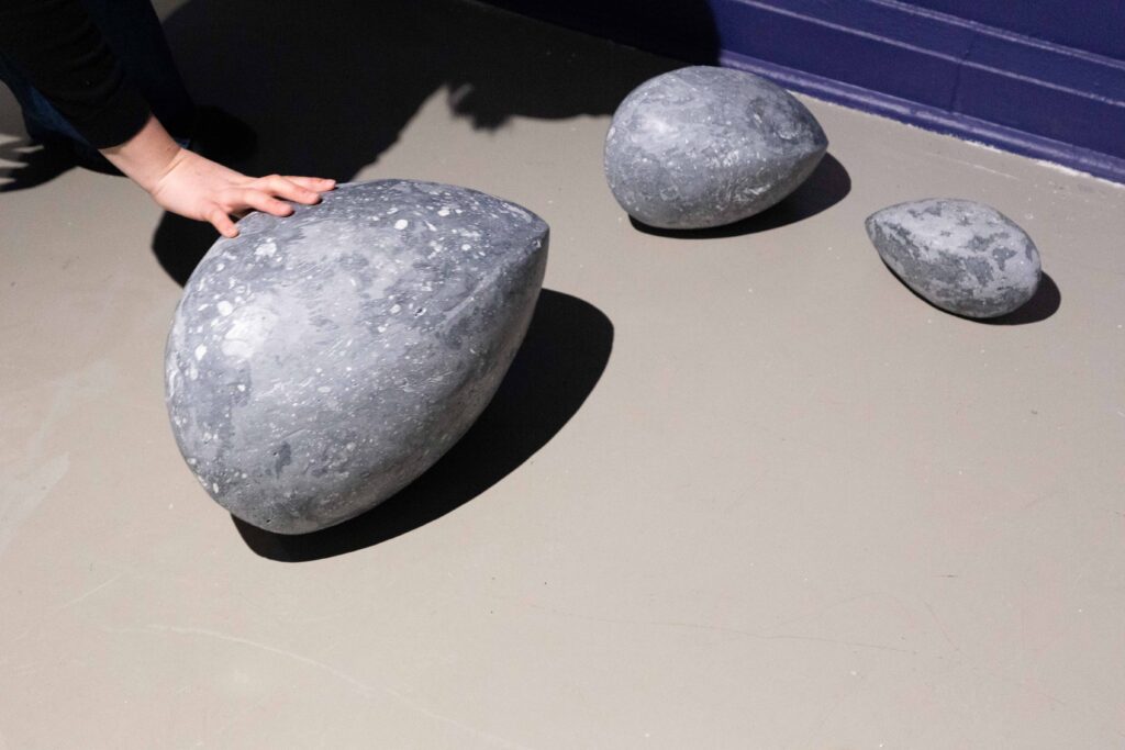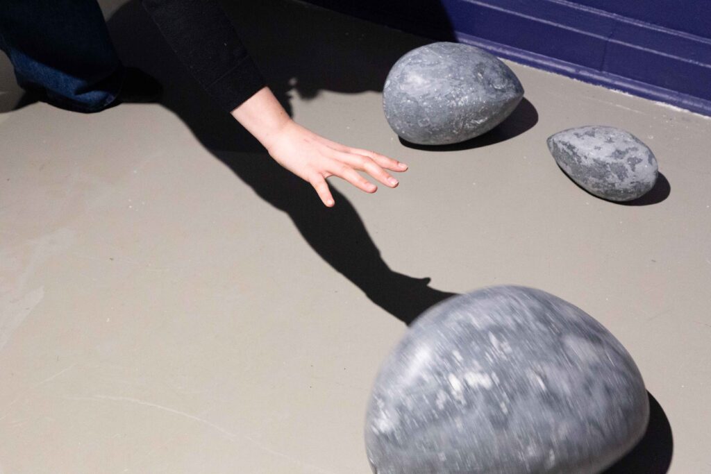 In my end is my beginning is an interactive installation that explores again & again as a theme through the repetition of multiples and the cyclical motion of oloids: a non-orientable form similar to a mobius strip. Oloids have no top nor bottom, beginning or end, ensuring the viewer’s physical engagement with the sculptures is embodied within turning and re-turning both physically and perceptually. The way the form presents itself differently at every turn speaks to how multiple truths are held simultaneously, and how there will always be something we cannot see from our vantage point.