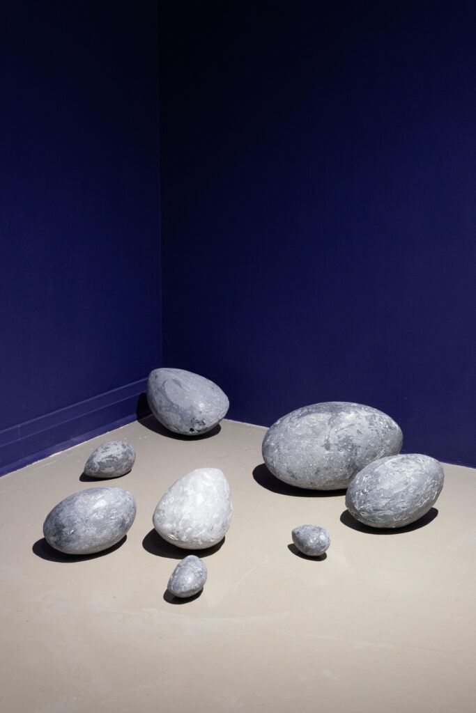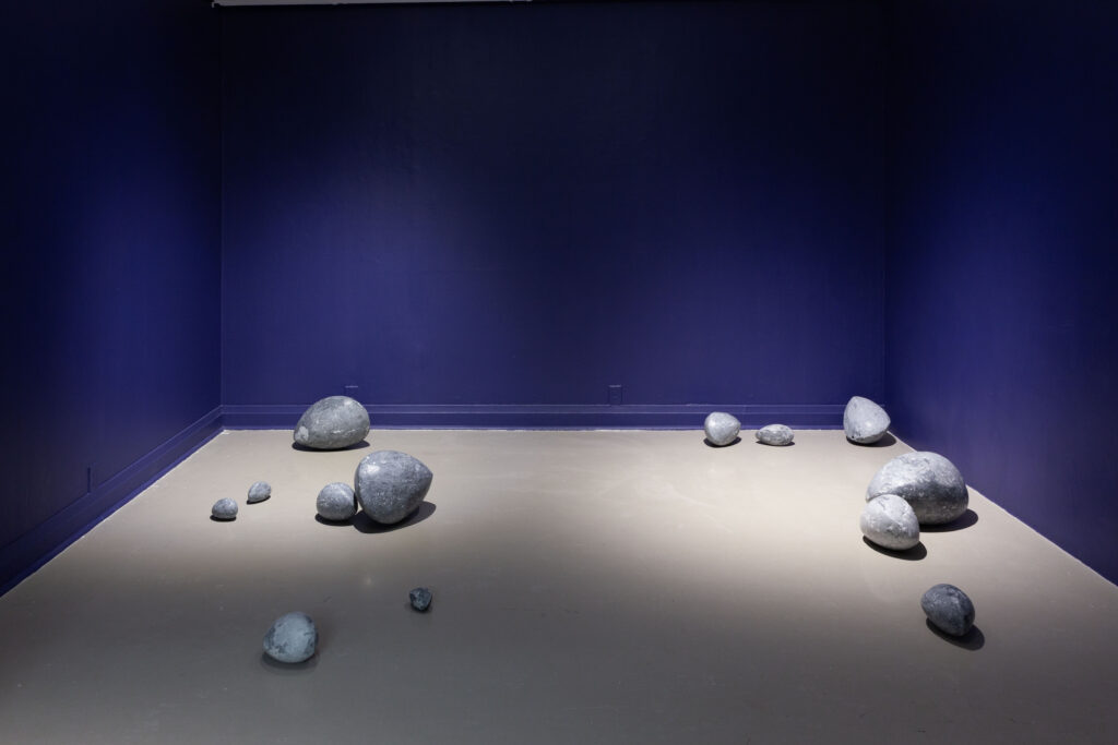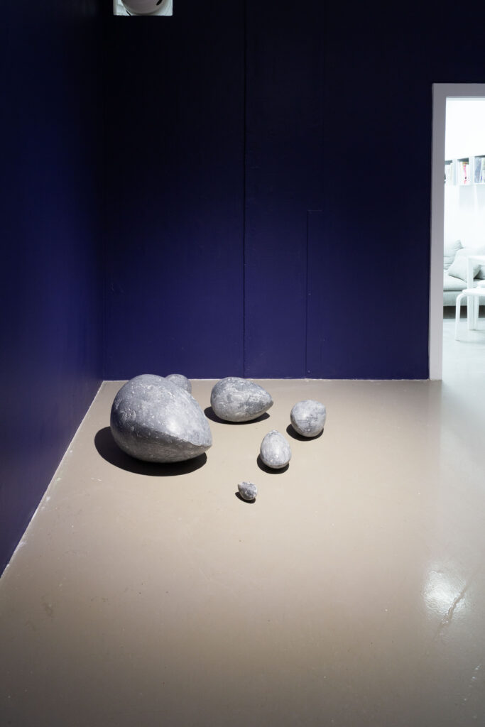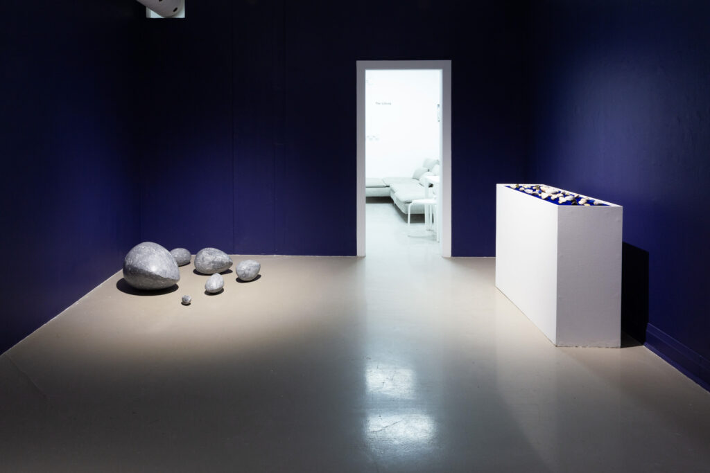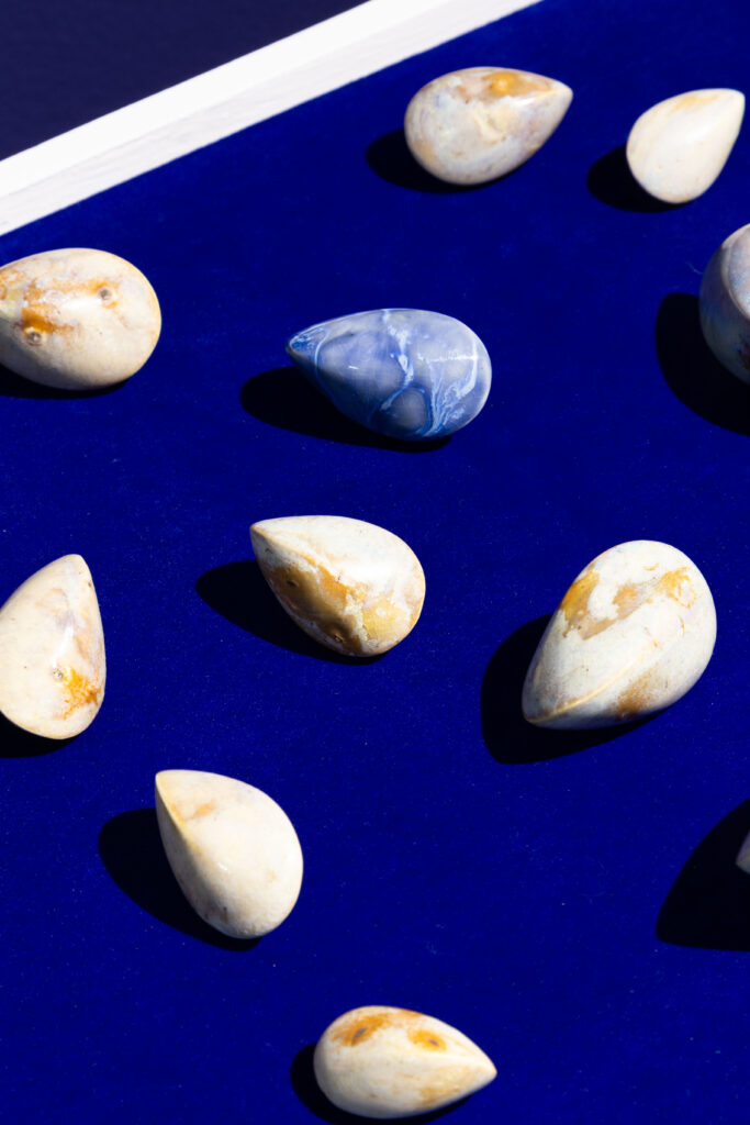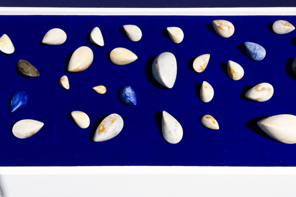 In my end is my beginning is an interactive installation that explores again & again as a theme through the repetition of multiples and the cyclical motion of oloids: a non-orientable form similar to a mobius strip. Oloids have no top nor bottom, beginning or end, ensuring the viewer’s physical engagement with the sculptures is embodied within turning and re-turning both physically and perceptually. The way the form presents itself differently at every turn speaks to how multiple truths are held simultaneously, and how there will always be something we cannot see from our vantage point.