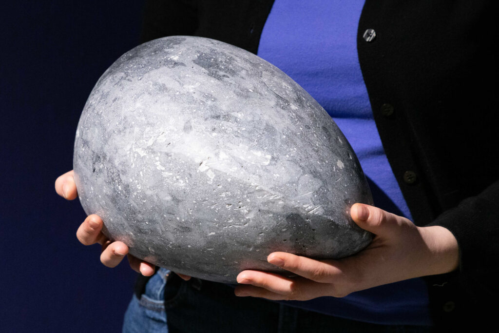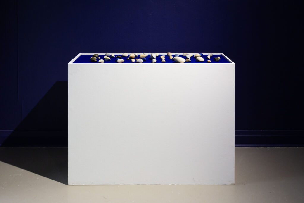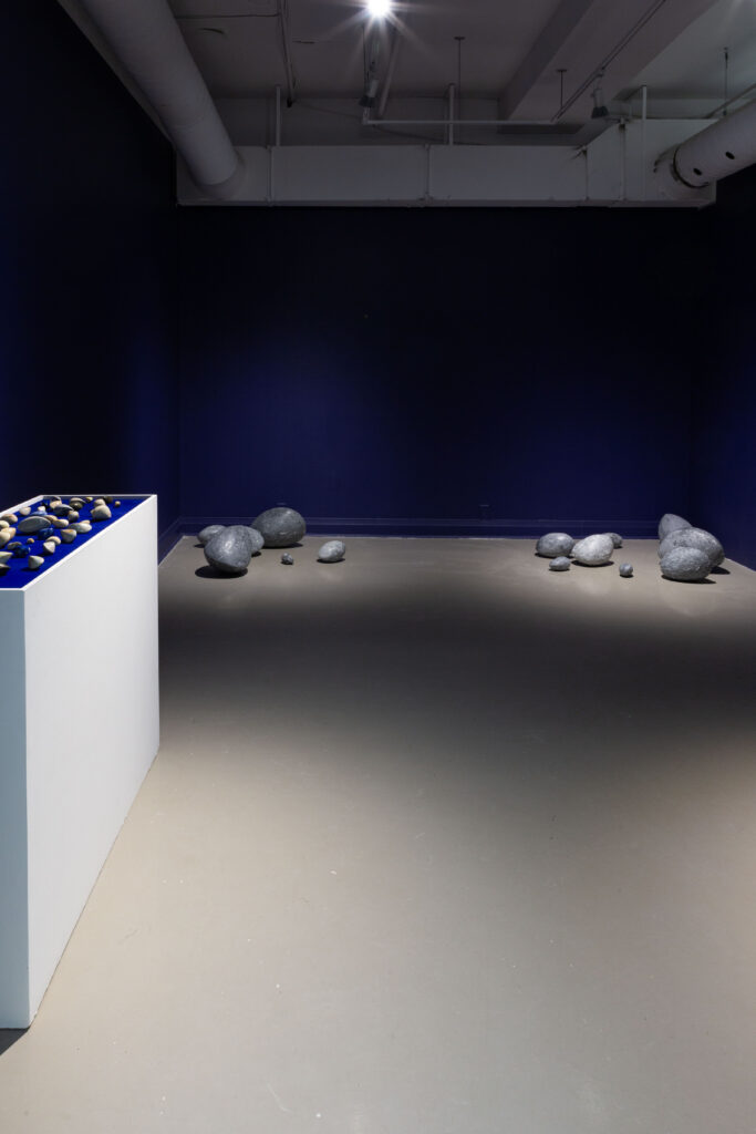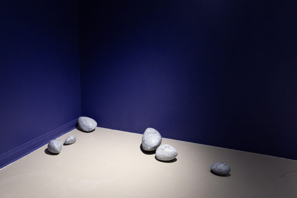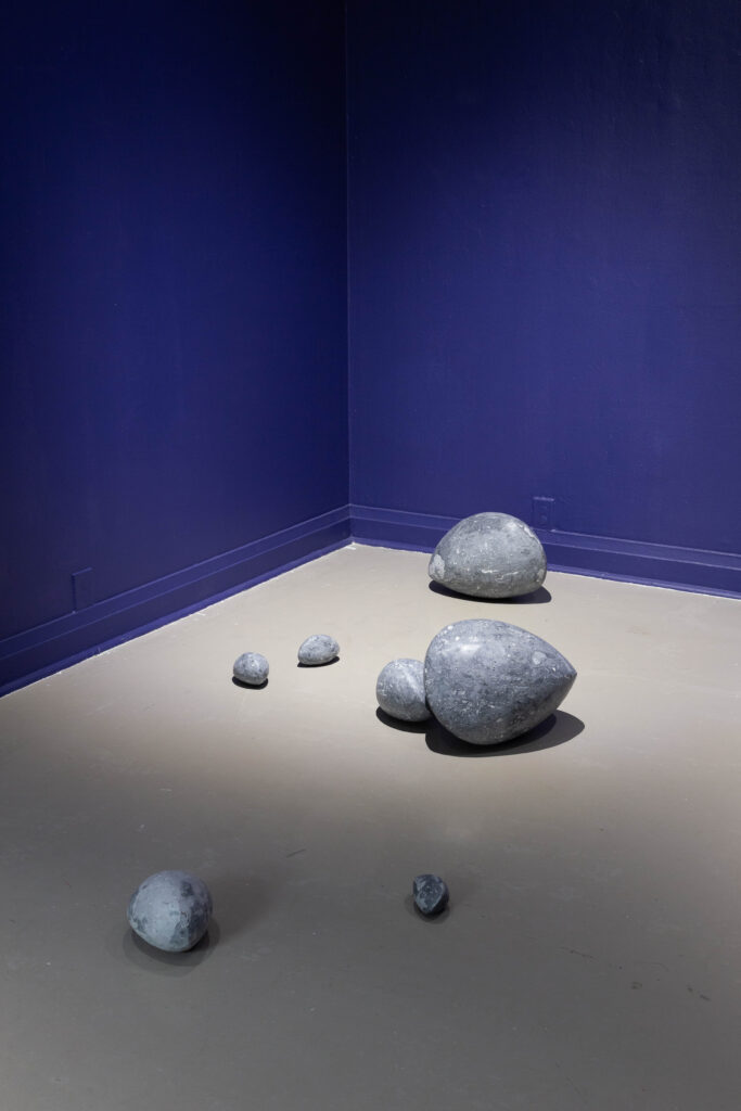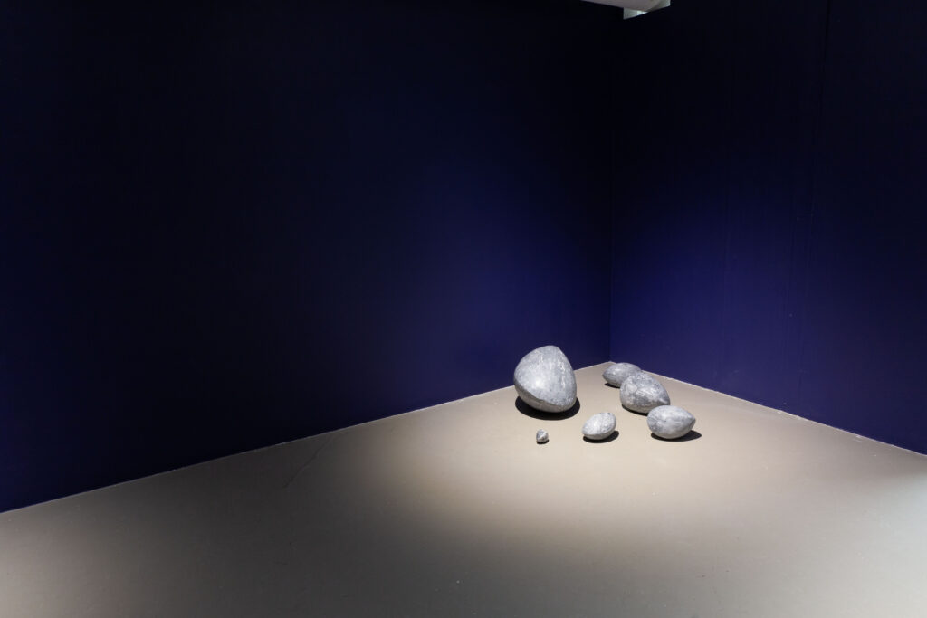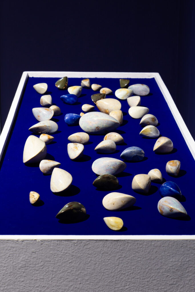 In my end is my beginning is an interactive installation that explores again & again as a theme through the repetition of multiples and the cyclical motion of oloids: a non-orientable form similar to a mobius strip. Oloids have no top nor bottom, beginning or end, ensuring the viewer’s physical engagement with the sculptures is embodied within turning and re-turning both physically and perceptually. The way the form presents itself differently at every turn speaks to how multiple truths are held simultaneously, and how there will always be something we cannot see from our vantage point.