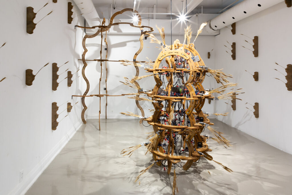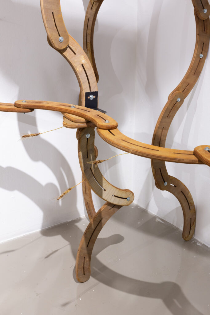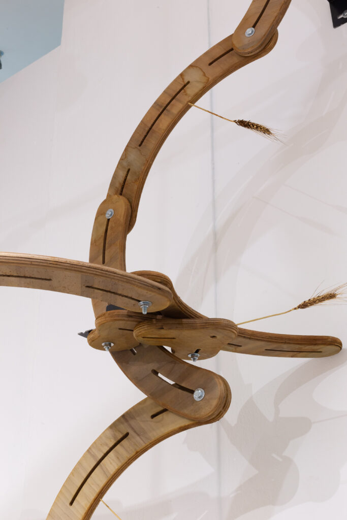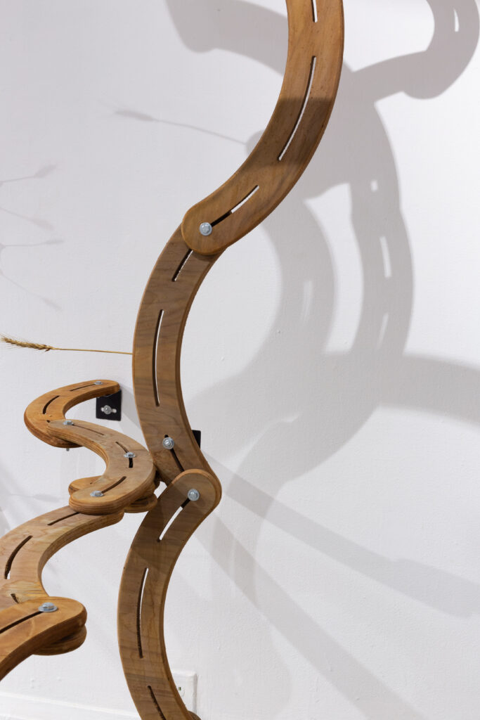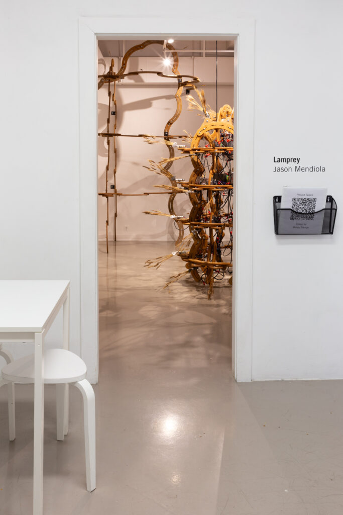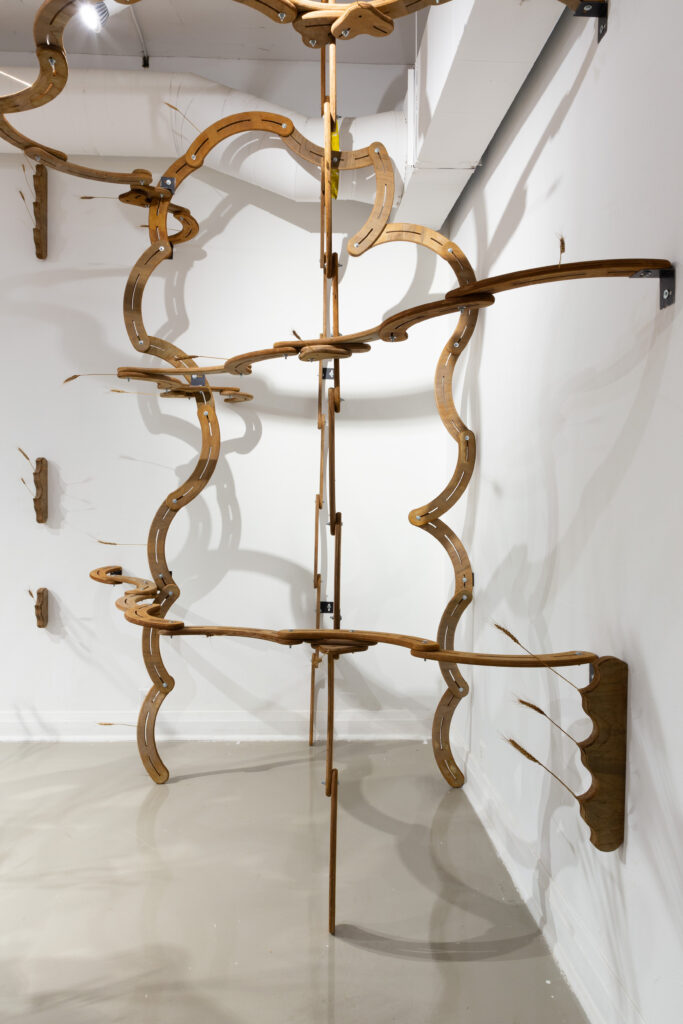 Lamprey is a sculptural installation that engages proprioception, affect, and the philosophical notion of persistence over time. Composed of lattice plywood forms and delicate organic elements, the work holds quiet tension within its structure—offering space for absences, and the potential for change. Drawing on ideas of unfolding through temporal parts, Lamprey progresses through gestures that resist immediacy, inviting viewers into a suspended engagement with material and motion. Treated surfaces appear rusted, muted, and softly deteriorated—material states that exist in a continuous process of transformation.