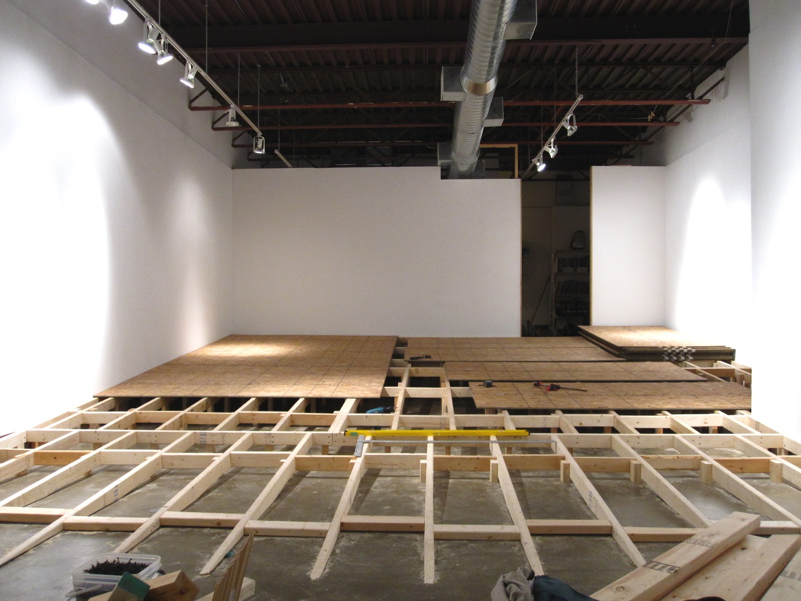 Slanted floor I designed and built for Amy Lam and Jon McCurley. Aproximatly 28′ x 21′ with a 4º slant, this installation spans most of the main space of Xpace Cultural Centre at 58 Ossington Ave. Built as the foundation for a film set, as well as a month long collective art thing involving several different artists in three phases. Each group will react to the space and the work of the previous artists, reinterpreting what is left behind to suit their needs, and altering it in whatever way they see fit. . . Thanks to Seth, Courtney, Filip and Luke, who helped out big time.