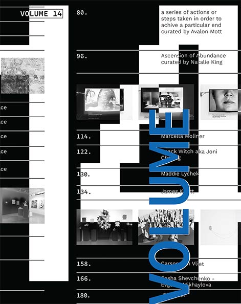 VOLUME is Xpace Cultural Centre’s annual anthology of exhibitions, essays and interviews. These essays demonstrate the breadth of exhibitions, artists and designers that contribute to Xpace’s place as a vibrant part of Toronto’s emerging arts community. All publications are designed and produced by students and emerging graphic designers as part of an Institutional Work Study Plan together with OCAD University. Current and previous copies of VOLUME are available for purchase at Xpace Cultural Centre for a suggested donation of $20 CAD.