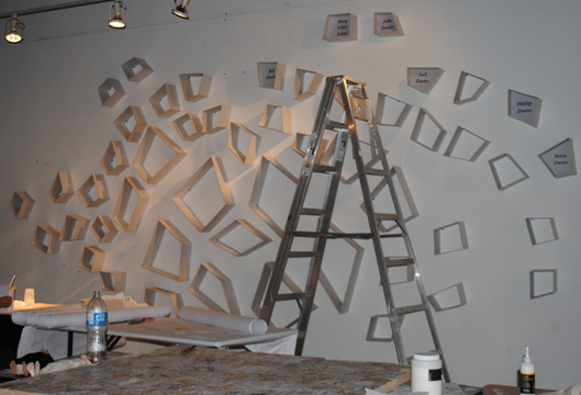 KP: I’ve wanted to touch on the subject matter for a while, but I only really thought of this idea after I got this residency which gave me the opportunity to make this big body of work that is funded and exhibited. By the time I came to my orientation for the residency I had this idea in mind and got started on it. I’ve been really strapped for time though because it’s been a lot of trouble-shooting. For example, I started making all of the boxes in wood and had completed 14 of them before realizing that it wasn’t going to work because I was using 1 x 6’s which people usually buy for making fences and don’t care if the wood is warped. I went through the entire bin and their new shipment – they were all warped, so unless I wanted to spend about 20.00 on one plank of pine (which I wouldn’t have been able to afford) I had to change my materials.